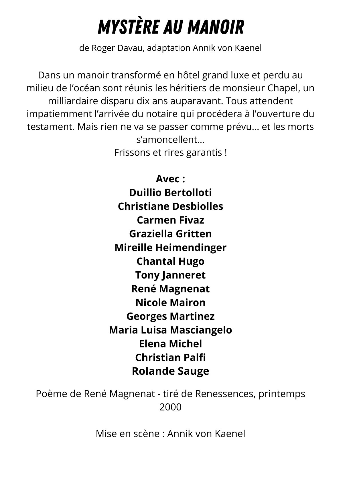 La troupe de théâtre du MDA « Tous en scène » vous convie à son spectacle 2026 : « MYSTÈRE AU MANOIR »